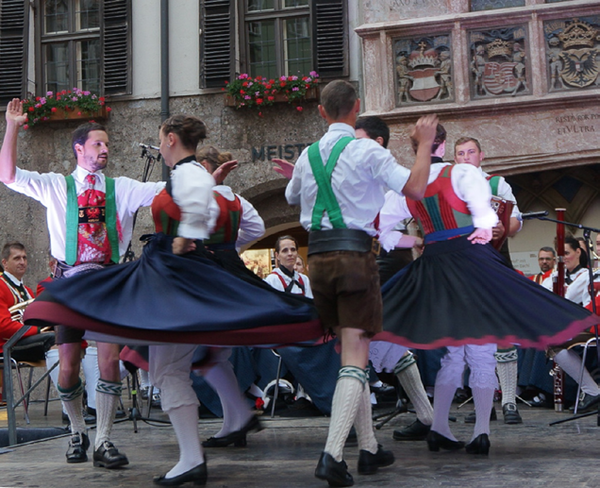 The two sectors, the Oral and Instrumental are creating a wonderful environment for folk dancing, especially during the many summer events held in most of the villages in the alps. One of the most popular dances is the “Landler” a simple dance features hopping and stamping with music in 3/4 time, the dancers turn under each other’s arms using different arm and hand holds, dance back to back, and grasp each other firmly to turn around and around. Still the “Landler” is popular in small villages high in the alps where strong shoes needed to reach the dancing place, rather the city stile Walz where it is recommended use of light shoes with flat leather sole to move and turn more easily.