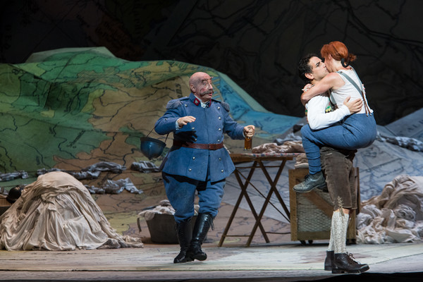 한편, 로랑 펠리(Laurent Pelly)의 무대연출은 마치 거대한 지도가 입체적으로 접혀 언덕을 형성한 것처럼 보였다. 간결하면서도 함축적인 무대연출은 당시의 시대상을 잘 묘사하여, 오페라의 줄거리를 한층 더 명확하게 부각시켰다. 그리고 등장인물들이 지도 언덕을 넘는 모습을 보면서 마치 국경이라도 넘는 것처럼 전시의 상황이 생생하게 다가왔다. 무엇보다, 2막에서 불현듯 탱크가 등장해 모두를 긴장시켰다. 그렇다.
