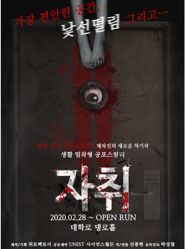 공포연극 1위 <조각 : 사라진 기억> 제작진이 야심차게 내놓은 차기작, 공포스릴러연극 <자취>. 연극 <자취>는 참신한 소재로 현실적인 공포감을 조성해 “생활밀착형 공포스릴러”라는 새로운 연극을 선보인다.