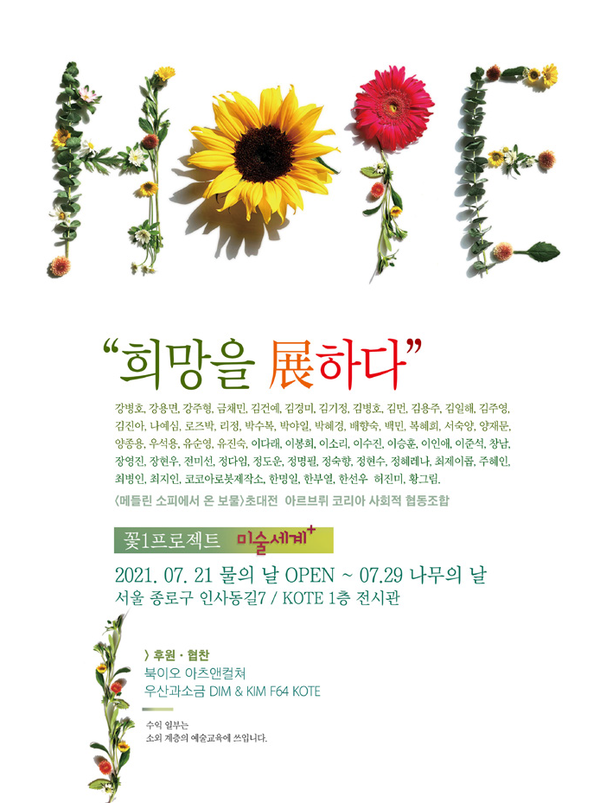 전시를 기획하는 ‘꽃1프로젝트’와 ‘미술세계 플러스’는 전시에서 발생하는 수익 일부를 사회적으로 소외된 계층의 사람들에게 문화예술의 교육 기회를 제공하는 데 사용할 것을 밝혔다. 예술가로서의 첫 번째 ‘희망’은 작품 자체에 매료되어 작품을 구매하는 것이다. 후원금액의 전달이 아닌 ‘문화예술교육’이 한 개인의 삶에 지대한 ‘희망’이 될 수 있다는 것이 두 번째 이유다.