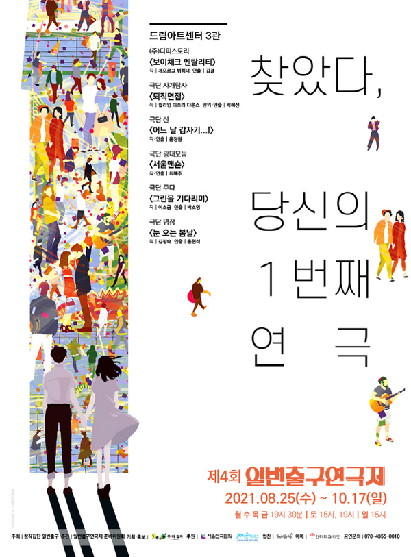 8월 25일(수)부터 10월 17일(일)까지, 대학로 드림아트센터 3관에서 제4회 1번출구 연극제를 채울 작품은 (주)디피스토리의 <보이체크 멘탈리티>, 극단 ‘사개탐사’의 <퇴직 면접>, 극단 '산'의 <어느 날 갑자기...!>, 극단 ‘광대모둠’의 <서울맨숀>, 극단 ‘주다’의 <그린을 기다리며>, 극단 ‘명장’의 <눈 오는 봄날>로, 단순히 수만 늘어난 것이 아니라, 독특하면서도 친근한 소재의 작품들이 선발되어 눈길을 끈다. 이는 ‘1번출구 연극제’의 ‘다양한’, ‘대중적인’이라는 기존 흐름을 이어나가는 행보로 볼 수 있다.