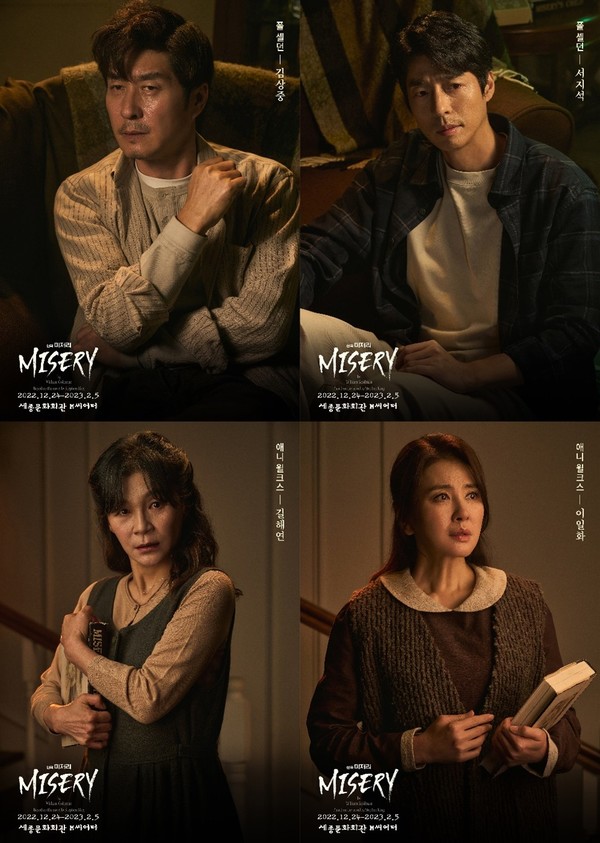 ‘폴 셸던’ 역에 김상중과 서지석은 번번이 탈출에 실패하고 마는 상황에서 절망감을 느끼는 감정 연기로 특히 히스테릭하면서도 열망을 담은 눈빛 연기를 선보였다. ‘애니 윌크스’의 광기를 보여주며 그녀의 끝없는 집착을 표현한 길해연, 이일화는 ‘폴’이 갇힌 방문 너머에서 그를 예의 주시하는 모습을 보여주고 있다. 이처럼 연극 <미저리>는 각 캐릭터들의 상반된 심리를 표현하며, 캐릭터 포스터 만으로도 서스펜스 스릴러 다운 면모를 보여 극 개막전부터 관객들의 기대감을 고조시켰다.