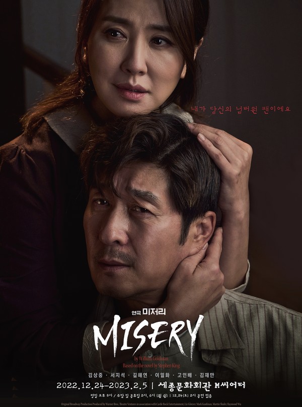 2015년 브로드웨이에서 초연된 연극 <미저리>는 미국의 대표 작가 스티븐 킹의 소설을 원작으로 1990년 개봉한 로브 라이너 감독의 동명 영화로 널리 알려졌다. 브로드웨이에선 브루스 윌리스가 출연하여 화제가 된 작품이다. 국내에선 2018년 2월 첫 선을 보인 후 지난 2019년 7월까지 연속해서 흥행한 최고의 작품이다.
