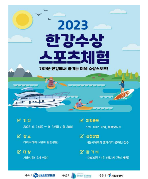 「한강 수상스포츠 체험」프로그램은 2016년부터 시작해 시민들의 호응도가 높았던 「가족 수상스포츠 체험교실」을 확대 운영하는 것으로 12세 이상 모든 시민이 참여 가능하며, 운영 종목과 회차도 대폭 확대했다.