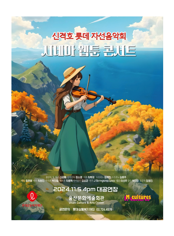 [아츠앤컬쳐] 울산 지역주민을 위해 '24년 하반기 신격호 롯데 자선음악회 '시네마 콘서트'가 열린다. 총감독 및 해설에 신금호, 음악감독에 정소영, 지휘 최혁재, 소프라노 정혜민, 소프라노 김효주, 테너 정호윤, 테너 최원진, 바리톤 박찬일, 바리톤 최병혁, 바이올린 김상균, 연주 J Strings(악장 김여진), 웹툰 이선우, 감수 박진경, 조감독은 장연진이 담당하며 해설이 있는 공연으로 누구나 쉽게 즐길 수 있는 오페라 콘서트다.