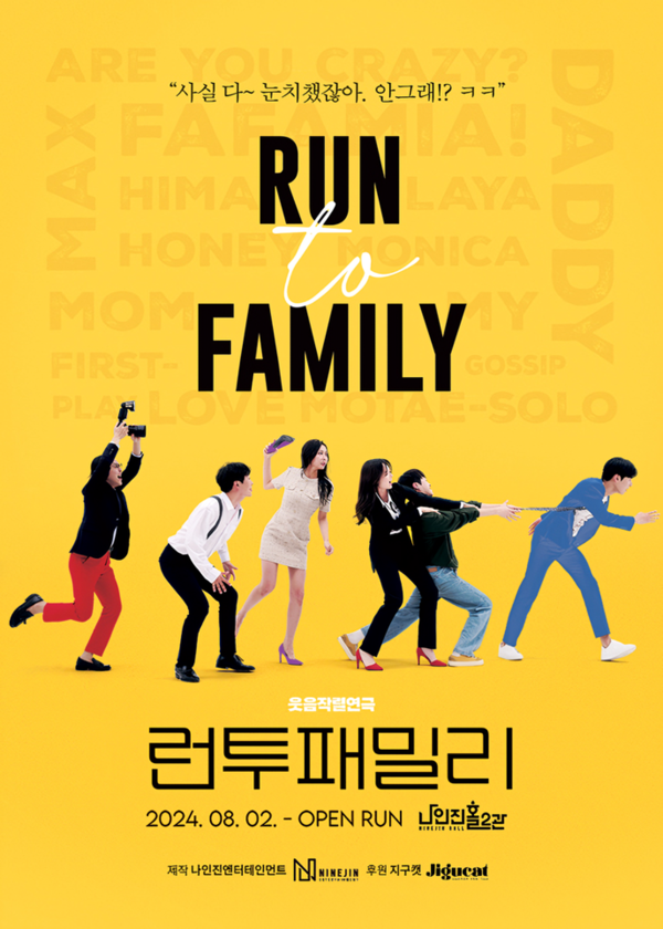 [아츠앤컬쳐] 나인진엔터테인먼트에서 제작한 ‘런투패밀리’는 현재 대학로 나인진홀 뿐만 아니라 울산 CK아트홀에서도 공연 중인 야심작이다. 친구, 연인, 가족 등 누구나 다 함께 즐길 수 있는 휴먼코미디 장르의 작품이다. 쉴 새 없이 전개되는 상황들 속에서 언제 터질지 모르는 웃음폭탄, 조마조마하게 보게 되는 예상치 못한 상황들로 눈을 뗄 수 없는 연극이다.