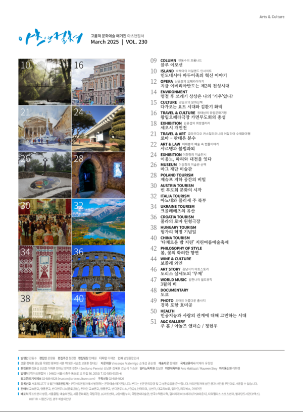 [아츠앤컬쳐] 관련기사 229호 목차 228호 목차 227호 목차 231호 목차 232호 목차 233호 목차 키워드 #아츠앤컬쳐 #artsnculture 아츠앤컬쳐 master@artsnculture.com 다른기사 보기 저작권자 © Arts & Culture 무단전재 및 재배포 금지 당신만 안 본 뉴스 비디오 아트의 아버지 백남준이 크로아티아를 만난 이유 예미 신간, 황인뢰슬갑소설 '장미 이야기' '파라마 파라가' 회고전: 와얀 쿤 아드냐나의 20년에 걸친 선의 탐구 팬텀 포 테너스 ‘마리 로랑생 회고전 : 무지개 위의 춤’ [연극열전10] 여덟 번째 작품 ‘마우스피스(Mouthpiece)’ 전쟁을 바라보는 또 다른 방식 비디오 아트의 아버지 백남준이 크로아티아를 만난 이유 댓글삭제 삭제한 댓글은 다시 복구할 수 없습니다. 그래도 삭제하시겠습니까? 비밀번호 닫기 기사 댓글 0 댓글 접기 로그인 후 이용 가능합니다. 댓글 내용입력 비회원 로그인 이름 비밀번호 댓글 내용입력 댓글쓰기 계정을 선택하시면 로그인·계정인증을 통해 댓글을 남기실 수 있습니다. 회원 로그인 비회원 글쓰기 이름 비밀번호 자동등록방지 로그인 옵션 창닫기 주요기사 'The Aesthetics of Possibility', SAMUEL DE SABOIA Fontane di Piazza San Pietro ‘마리 로랑생 회고전 : 무지개 위의 춤’ 연극 ‘오펀스(Orphans)’ 뮤직드라마 ‘불편한 편의점1’ [연극열전10] 여덟 번째 작품 ‘마우스피스(Mouthpiece)’