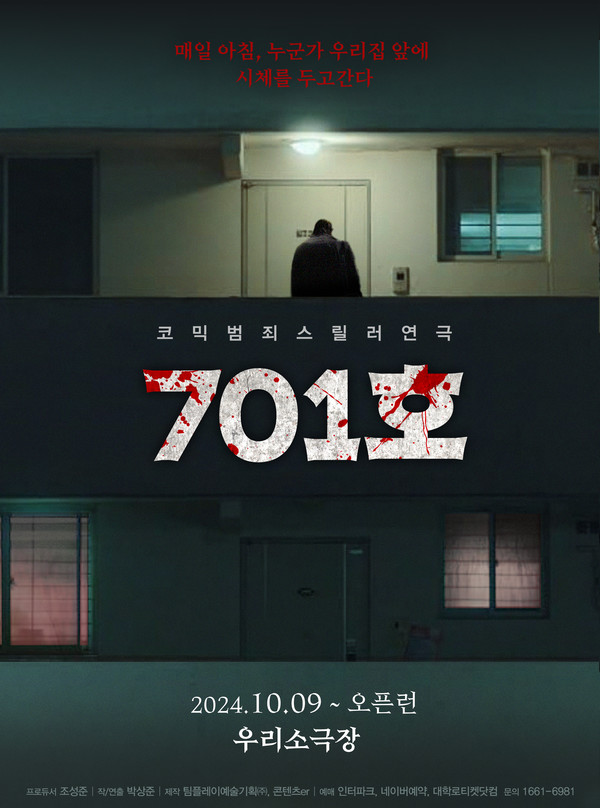 [아츠앤컬쳐] 숨 막히는 긴장감과 웃음을 자아내는 코믹 범죄 스릴러 연극 ‘701호’가 대학로에 찾아온다. 스릴러 연극 <701호>는 매일 새벽 6시, 집 앞으로 토막 난 시체를 가져다 놓는 범인과 납치된 아내를 구하기 위한 진석 사이에 펼쳐지는 쫓고 쫓기는 서스펜스로 이어지는 추적 스릴러 연극이다.