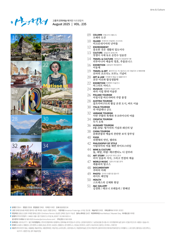 [아츠앤컬쳐] 관련기사 234호 목차 233호 목차 232호 목차 236호 목차 237호 목차 238호 목차 키워드 #아츠앤컬쳐 #artsnculture 아츠앤컬쳐 master@artsnculture.com 다른기사 보기 저작권자 © Arts & Culture 무단전재 및 재배포 금지 당신만 안 본 뉴스 강재희 개인전 'Garden In Fall' 2025 예술가의집 & 꽃피는몸 프로젝트 공동기획 프로그램 2025 국립오페라단 정기공연 Ⅳ '트리스탄과 이졸데' ‘2026년 문예회관 특성화 지원 사업’ 확대 개편 예미 신간, '바다는 작은 물을 가리지 않는다' 강재희 개인전 'Garden In Fall' 댓글삭제 삭제한 댓글은 다시 복구할 수 없습니다. 그래도 삭제하시겠습니까? 비밀번호 닫기 기사 댓글 0 댓글 접기 로그인 후 이용 가능합니다. 댓글 내용입력 비회원 로그인 이름 비밀번호 댓글 내용입력 댓글쓰기 계정을 선택하시면 로그인·계정인증을 통해 댓글을 남기실 수 있습니다. 회원 로그인 비회원 글쓰기 이름 비밀번호 자동등록방지 로그인 옵션 창닫기 주요기사 예미 신간, '바다는 작은 물을 가리지 않는다' ‘2026년 문예회관 특성화 지원 사업’ 확대 개편 2025 국립오페라단 정기공연 Ⅳ '트리스탄과 이졸데' 강재희 개인전 'Garden In Fall' 2025 예술가의집 & 꽃피는몸 프로젝트 공동기획 프로그램 호두까기 인형: 해설이 있는 명품 발레