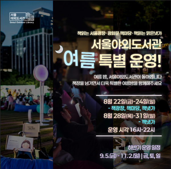 한편 서울야외도서관은 하반기 개장에 앞서 서울시립천문대와 함께 8월 22일(금)부터 24일(일)까지 3일간 ‘여름밤도서관’을 깜짝 운영한다. ‘여름밤도서관’에서는 별 관측회, SF영화 상영, 첼로 앙상블 공연 등 다채로운 즐길거리가 진행된다. 책읽는 맑은냇가는 8월 28일(목)부터 31일(일)까지 추가 운영할 예정이다.