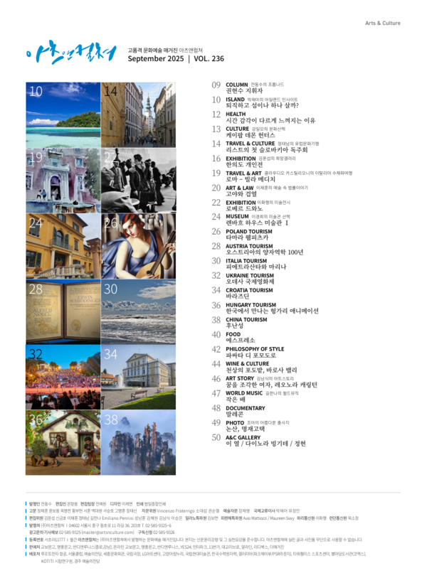 [아츠앤컬쳐] 관련기사 235호 목차 234호 목차 233호 목차 237호 목차 238호 목차 239호 목차 키워드 #아츠앤컬쳐 #artsnculture 아츠앤컬쳐 master@artsnculture.com 다른기사 보기 저작권자 © Arts & Culture 무단전재 및 재배포 금지 당신만 안 본 뉴스 비디오 아트의 아버지 백남준이 크로아티아를 만난 이유 예미 신간, 황인뢰슬갑소설 '장미 이야기' '파라마 파라가' 회고전: 와얀 쿤 아드냐나의 20년에 걸친 선의 탐구 팬텀 포 테너스 ‘마리 로랑생 회고전 : 무지개 위의 춤’ [연극열전10] 여덟 번째 작품 ‘마우스피스(Mouthpiece)’ 전쟁을 바라보는 또 다른 방식 비디오 아트의 아버지 백남준이 크로아티아를 만난 이유 댓글삭제 삭제한 댓글은 다시 복구할 수 없습니다. 그래도 삭제하시겠습니까? 비밀번호 닫기 기사 댓글 0 댓글 접기 로그인 후 이용 가능합니다. 댓글 내용입력 비회원 로그인 이름 비밀번호 댓글 내용입력 댓글쓰기 계정을 선택하시면 로그인·계정인증을 통해 댓글을 남기실 수 있습니다. 회원 로그인 비회원 글쓰기 이름 비밀번호 자동등록방지 로그인 옵션 창닫기 주요기사 'The Aesthetics of Possibility', SAMUEL DE SABOIA Fontane di Piazza San Pietro ‘마리 로랑생 회고전 : 무지개 위의 춤’ 연극 ‘오펀스(Orphans)’ 뮤직드라마 ‘불편한 편의점1’ [연극열전10] 여덟 번째 작품 ‘마우스피스(Mouthpiece)’