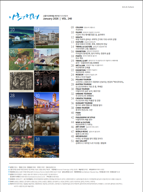 [아츠앤컬쳐] 관련기사 239호 목차 238호 목차 237호 목차 241호 목차 242호 목차 243호 목차 키워드 #아츠앤컬쳐 #artsnculture 아츠앤컬쳐 master@artsnculture.com 다른기사 보기 저작권자 © Arts & Culture 무단전재 및 재배포 금지 당신만 안 본 뉴스 비디오 아트의 아버지 백남준이 크로아티아를 만난 이유 예미 신간, 황인뢰슬갑소설 '장미 이야기' '파라마 파라가' 회고전: 와얀 쿤 아드냐나의 20년에 걸친 선의 탐구 팬텀 포 테너스 ‘마리 로랑생 회고전 : 무지개 위의 춤’ [연극열전10] 여덟 번째 작품 ‘마우스피스(Mouthpiece)’ 전쟁을 바라보는 또 다른 방식 비디오 아트의 아버지 백남준이 크로아티아를 만난 이유 댓글삭제 삭제한 댓글은 다시 복구할 수 없습니다. 그래도 삭제하시겠습니까? 비밀번호 닫기 기사 댓글 0 댓글 접기 로그인 후 이용 가능합니다. 댓글 내용입력 비회원 로그인 이름 비밀번호 댓글 내용입력 댓글쓰기 계정을 선택하시면 로그인·계정인증을 통해 댓글을 남기실 수 있습니다. 회원 로그인 비회원 글쓰기 이름 비밀번호 자동등록방지 로그인 옵션 창닫기 주요기사 'The Aesthetics of Possibility', SAMUEL DE SABOIA Fontane di Piazza San Pietro ‘마리 로랑생 회고전 : 무지개 위의 춤’ 연극 ‘오펀스(Orphans)’ 뮤직드라마 ‘불편한 편의점1’ [연극열전10] 여덟 번째 작품 ‘마우스피스(Mouthpiece)’