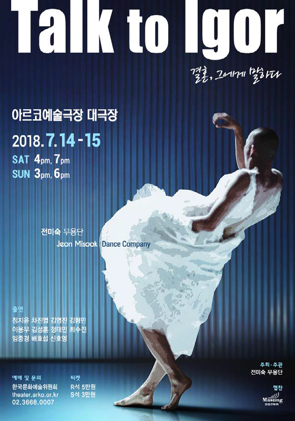 [아츠앤컬쳐] 2016년 세계적인 무용축제 독일 탄츠메세 초청으로 화제를 모은 안무가 전미숙이 <Talk to Igor/ 결혼~ 그에게 말하다>를 올린다. 전미숙 안무가는 이번 작품을 통해 사회적 통과의례로 받아들여진 ‘결혼’이 현대 사회에서 갖는 의미, 결혼 관계 속에 내재된 혼돈과 광기, 결혼의 진정성에 대한 고민, 결혼을 향한 시대의 정서 등을 세계적인 작곡가 이고르 스트라빈스키(Igor Stravinsky)와 나눈다.