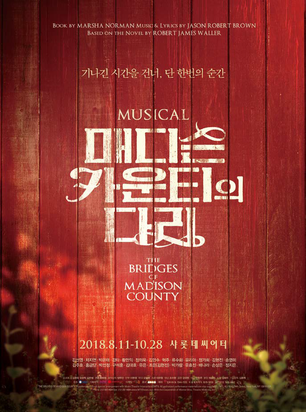 뮤지컬 ‘매디슨 카운티의 다리’는 동일한 원작 소설을 바탕으로 먼저 제작된 바 있는 영화와 달리, 뮤지컬에서는 특히 원작에 보다 충실하게 작중 인물이 원작의 주인공들과 마찬가지로 연령이나 정서적 측면에서 보다 젊어졌다. 브로드웨이와 마찬가지로 한국에서도 이에 따라 소설의 주인공과 실제 비슷한 연령의 배우를 캐스팅하는 신중함을 보였다. 작품의 두 주인공 ‘프란체스카’와 ‘로버트’ 역에는 각각 김선영과 차지연, 박은태와 강타가 확정됐다.