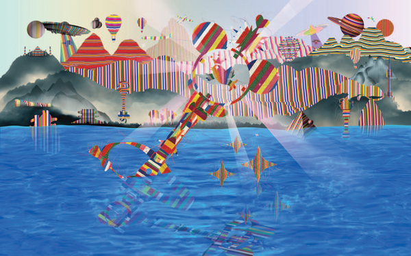 작품의 세부적인 요소에 대하여 설명하자면, 뒤에 보이는 작은 산들은 색동 컬러가 칠해지지 않았고, 반면에 높은 산들과 앞쪽에 위치한 산들은 색동 컬러가 칠해져 있습니다. 그 의미는 물속에 떠 있는 요술봉을 잡아 휘리릭 소원을 빌기만 한다면, 모든 마법과도 같은 순간이 실제로 더욱 가깝게 펼쳐질 것이라는 의미를 담고 있습니다.
