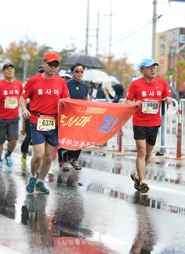오전 11시를 넘겨 신매대교(20km)로 들어섰다. 풀코스의 거의 절반을 온 셈이다. 여럿의 도우미들이 김구 선배의 손목을 번갈아 잡고 달리다 보니 김 선배의 페이스가 다소 흔들리는 게 느껴졌다. 춘천댐으로 향하는 오르막에서 김구 선배, 도우미 모두 거친 숨을 토해냈다. 언제부턴가 비치던 빗방울이 빗줄기로 변해 얼굴을 때렸다. 한기를 느끼기는커녕 가을비의 운치가 더해져 선수들의 환호성이 여기저기 터져 나왔다.