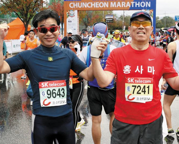 오전 9시, 앞뒤로 꽉 찬 선수들 틈에 끼어 떠밀리듯 앞으로 나아갔다. 출발은 순조로웠다. 의암댐을 건너 삼악산 입구(10km)를 지났지만 춘천 호반길은 여전히 선수들로 꽉 찼다. 나 또한 김구 선배만큼이나 홍사마 덕에 고교 동문과 각별한 인연을 맺었다. 고등학교를 중퇴하고 내 청춘의 소중한 부분을 잊고 살았다. 어쩌면 애써 떠올리지 않으려 했는지 모른다. 그리고 너무 먼 길을 돌아 50줄에 들어서야 모교 교정을 다시 밟았다. 그때 나에게 격려와 용기를 불어넣어 준 사람이 뒤늦게 만난 홍사마의 선후배들이다. 내 인생의 단절된 흔적을 치유해준 홍사마를 나는 여전히 사랑한다.