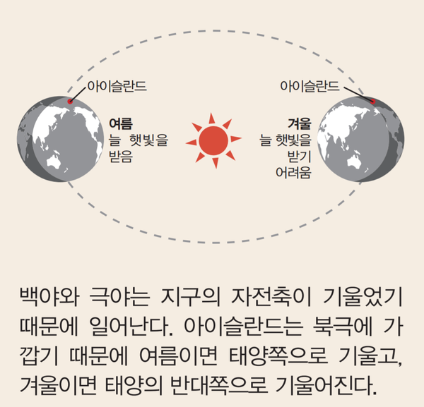 아이이슬란드는 봄, 여름, 가을, 겨울이 아니라 여름과 겨울만이 존재한다. 11월~4월까지 겨울이 지속되어 봄은 건너뛰고, 여름에 백야는 해를 맞이하는 축제와 다름없다. 여름에 아이슬란드 관광객이 몰려들어 숙소를 찾기 힘든 것은 이 때문이다.