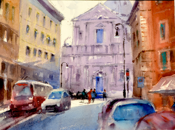 [아츠앤컬쳐] 리나쉬멘토 거리는 친퀘 루네 광장에서 성 안드레아 델라 발레 성당 사이의 길로 파리오네와 성 에우스타키오 지구로 나뉜다(수채화의 왼쪽은 판테온을 포함한 성 에우스타키오이며, 오른쪽은 나보나 광장을 포함한 파리오네이다).