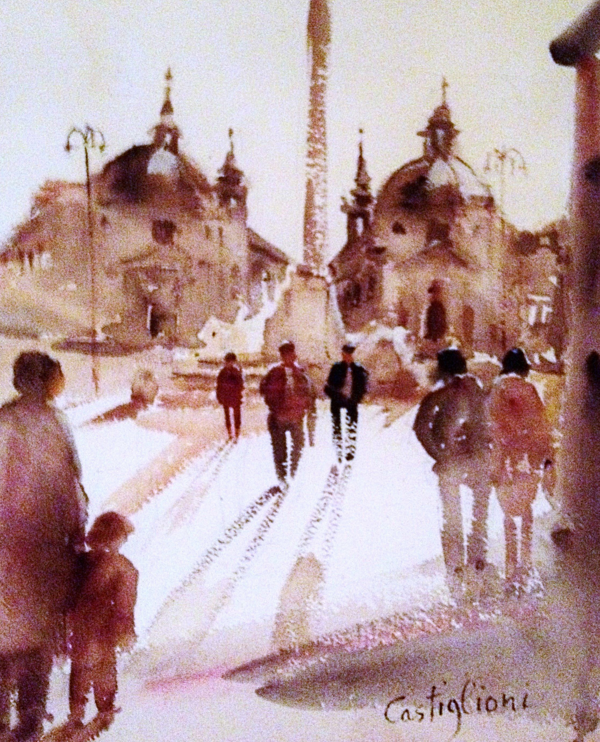 Piazza del Popolo Lo spettro di Nerone vagava paurosamente nelle notti romane fra il Tevere e quel tratto abbandonato delle mura Aureliane. Per metterlo in fuga si dovette costruire la grandiosa chiesa di Santa Maria del Popolo attualmente gestita da padre Amedeo Eramo per conto dei padri Agostiniani e amico dell’Associazione Romana Acquerellisti che in quel complesso ha la sua sede.