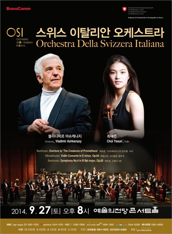 [아츠앤컬쳐] 스위스 속의 작은 이탈리아로 불리는 호반의 도시 루가노에 자리 잡고 있는 스위스 이탈리안 오케스트라(OSI)가 아시아 지역의 첫 투어로 2014년 음악감독 및 지휘자로 재직하는 마에스트로 블라디미르 아쉬케나지와 내한공연을 함께한다. 협연은 재능과 음악적 감수성을 높이 평가받아 안네 소피 무터 재단의 후원을 받고 있으며 한국인으로는 최초 유럽문화상 신인 연주자상을 수상한 바이올리니스트 최예은과 함께한다.