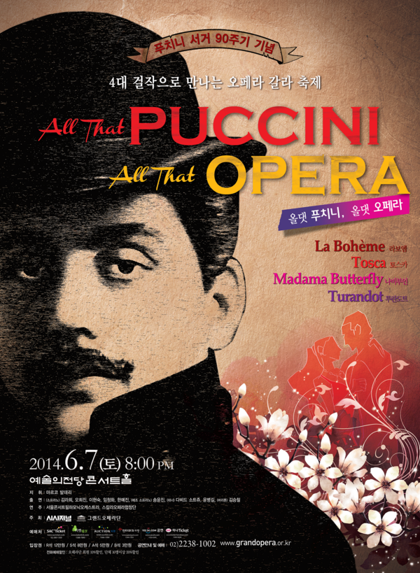 그랜드오페라단은 매년 유명 오페라 작곡가들의 작품을 집중 조명하는 의도로 갈라 콘서트 시리즈를 이어가고 있다. 지난 2013년에는 베르디 탄생 200주년을 기념하여 <올댓 베르디, 올댓 오페라(All that Verdi, All that Opera)>갈라 콘서트를 개최한 바 있으며 올해는 그 두 번째 시리즈로 푸치니의 작품으로 무대를 꾸민다. 근대 이탈리아 오페라를 대표하는 푸치니의 생애와 음악세계를 재조명하고 400여 년을 이어온 오페라의 예술적 가치를 되새겨볼 그랜드오페라단의 갈라 콘서트 <올댓 푸치니, 올댓 오페라(All that Puccini, All that Opera)>는 6월 7일 오후 8시 예술의전당 콘서트홀에서 열린다.