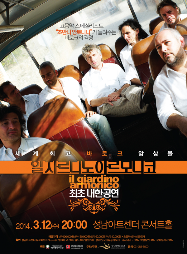 <일 자르디노 아르모니코> 일시 : 2014년 3월 12일(수) 8시 장소 : 성남아트센터 콘서트홀 티켓 : VIP석 10만원, R석 8만원, S석 6만원, A석 4만원
