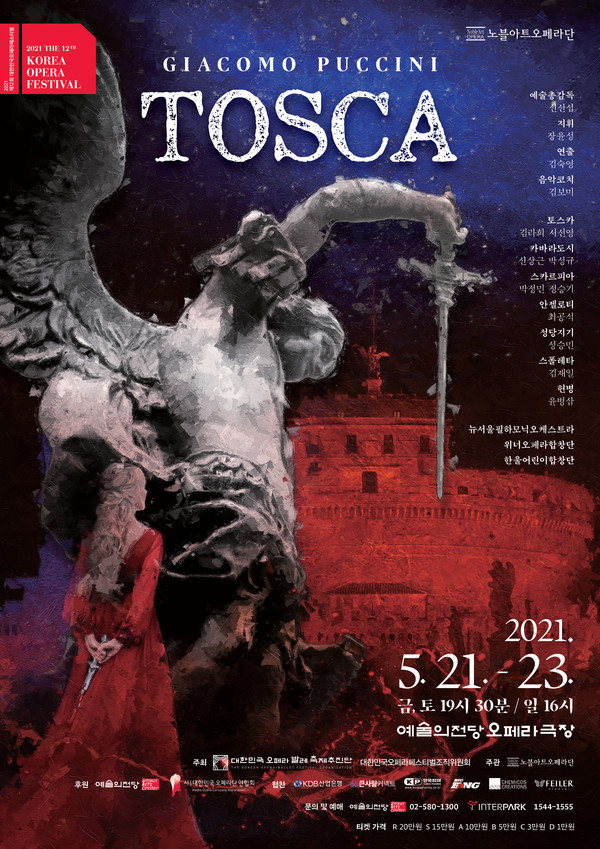 올해(2021년)로 열두 번째를 맞는 대한민국오페라페스티벌이 5월 1일부터 6월 6일까지 약 한 달간 예술의전당과 국립극장에서 펼쳐진다. 올해에 선정된 여섯 편의 작품 중 노블아트오페라단(단장 신선섭)은 <토스카>로 관객들을 찾아갈 예정이다.
