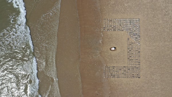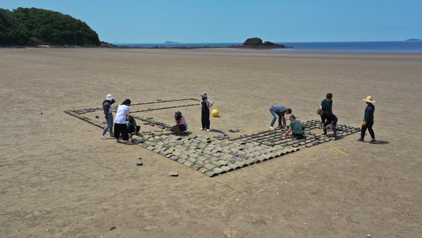 [아츠앤컬쳐] 지난 5월 11일, 아침 일찍 고속버스를 타고 2시간 20분을 달려 안면도에 도착했다. 그리고 꽃과 나무가 우거진 소무펜션에서 하루를 묵고 다음날 대지미술 퍼포먼스가 진행되는 안면도 두여해변으로 가서 11명의 설치 참가자들과 조선시대 기와를 해변으로 옮기는 작업을 했다. 밀물이 오기 전에 기와를 모두 옮겨 해변 위에 ‘ㄷ’자 형태로 설치했고 바닷물이 들어오고 다시 썰물이 된 다음까지 드론 촬영을 진행했다. 처음에 설치했던 기와를 다시 수거하는 작업을 끝내기까지는 거의 8시간이 소요되었다.