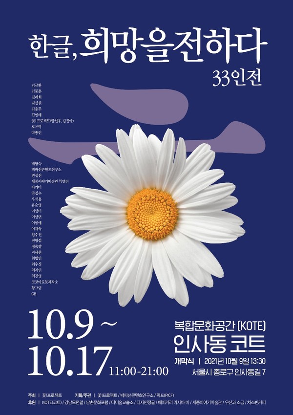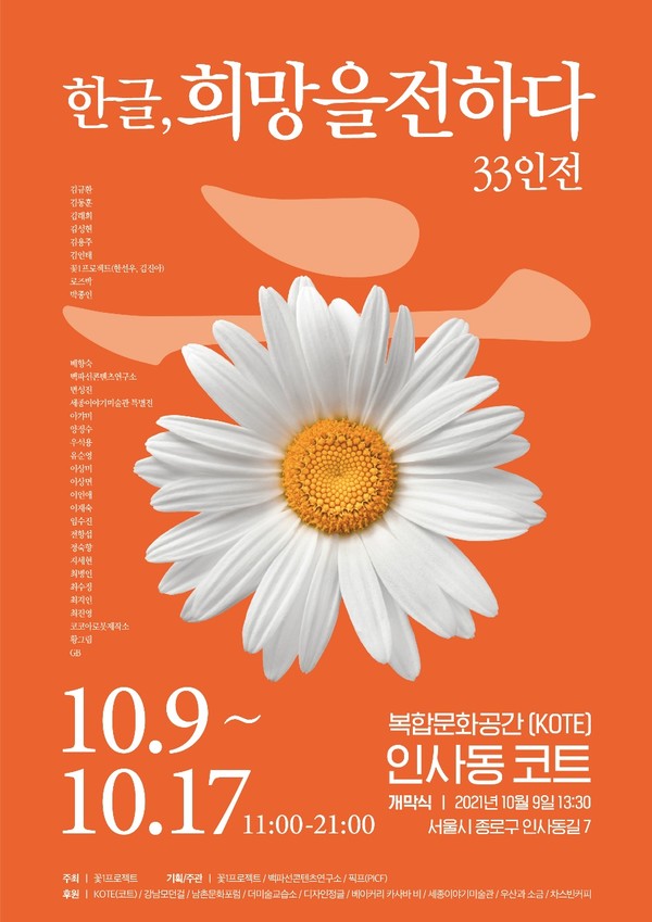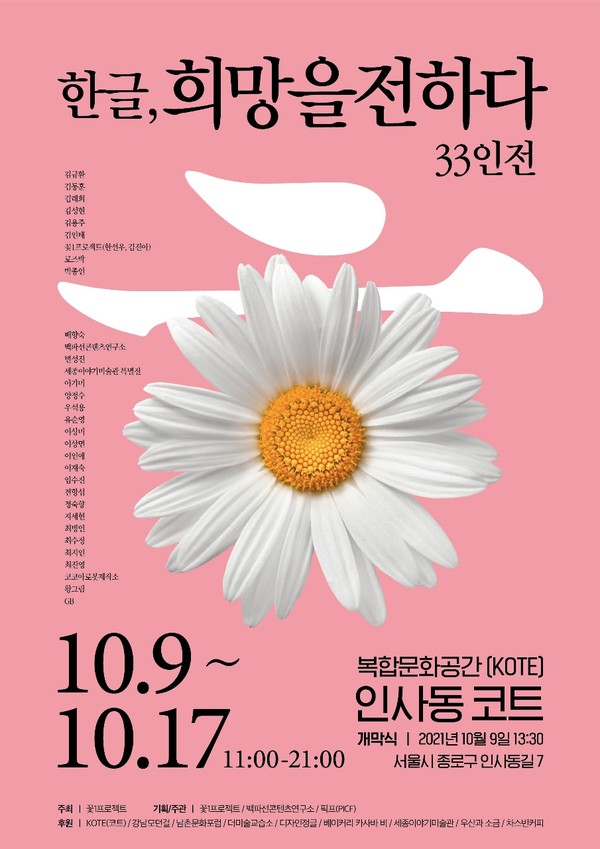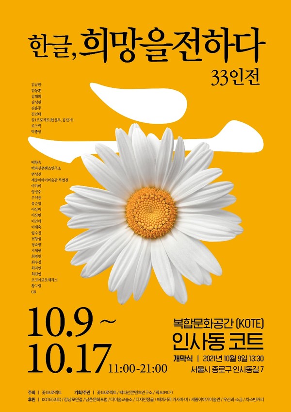 이번주 주말인 10월 9일 한글날에 33명의 예술창작자들이 한 자리에 모여 예술과 문자를 주제로 한 ‘희망을 전하다’ 전시를 개최한다.