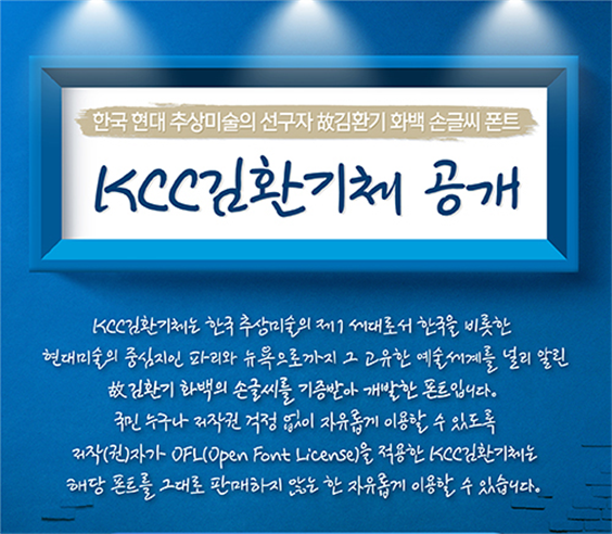 □ ‘KCC김환기체’의 무료 글꼴 나눔을 통해, 김환기 화백의 예술세계를 잘 알거나 손글씨의 맛을 즐기는 분들뿐만 아니라 기계적인 타이핑 글씨에 익숙해진 다양한 세대의 많은 분들이 사용하시기를 바라며 제작되었습니다. 나아가 김환기 화백의 예술세계에 대한 관심도 키울 수 있기를 기대합니다.