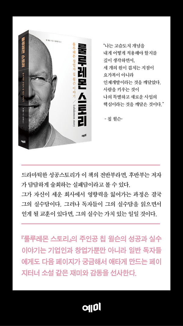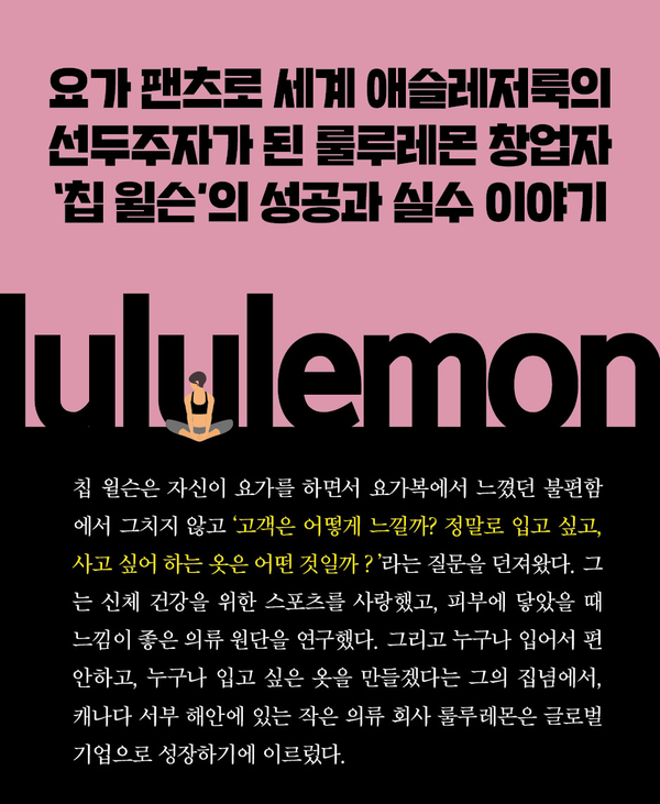 『룰루레몬 스토리』의 주인공 칩 윌슨의 성공과 실수 이야기는 기업인과 창업가뿐만 아니라 일반 독자들에게도 페이지터너 소설 같은 재미와 감동을 선사할 것이다.