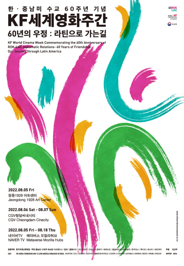 [아츠앤컬쳐] 한국국제교류재단은 영화를 통해 세계와의 상호 공감과 소통을 증진하기 위해 2020년부터 해마다 세계 각국의 영화를 선보이는 KF세계영화주간을 개최해오고 있다. 올해 세 번째로 개최되는 KF세계영화주간은 "60년의 우정: 라틴으로 가는 길"을 주제로 한국과 중남미 12개국과의 외교 관계 수립 60주년을 축하하기 위해 마련된 행사입니다. 아르헨티나, 칠레, 콜롬비아, 코스타리카, 도미니카 공화국, 에콰도르, 엘살바도르, 과테말라, 온두라스, 멕시코, 파나마, 파라과이가 그 주인공이다.