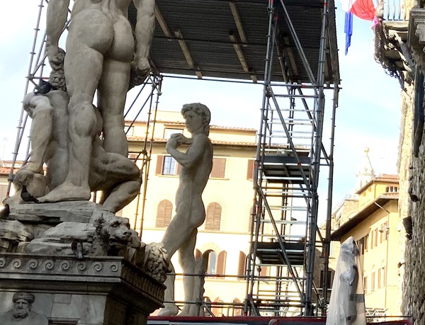 오늘날 많은 관광객들은 베키오궁 앞에 세워진 복제품 다비드 조각상을 배경으로 사진을 찍으며 즐거워 한다.