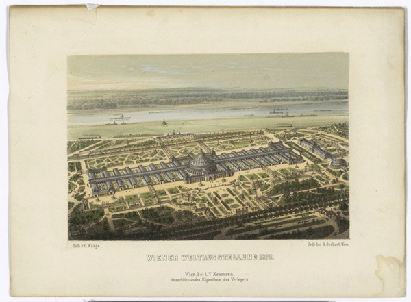 The Vienna World Exhibition was located at the Vienna “Prater”, the former imperial hunting ground, which Emperor Josef II had already donated to the Viennese population as a recreation area in 1766. This area had a total area of about 233 hectares, of which 16 hectares were built. The area was about five times the size of the previous world exhibition in Paris. The center place was “The Industrial Palace” with its enormous dimensions. Its representative centre was an iron central building: “The Rotunda”.