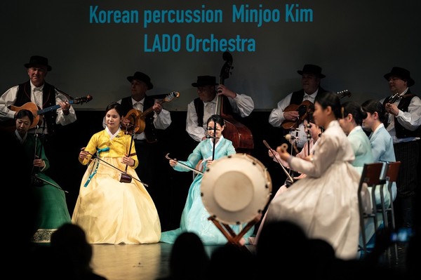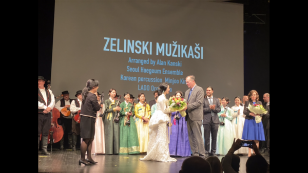 The concert was organized by the Korean Embassy in Croatia and the City of Zagreb. The public in the fully packed Croatian Lisinski Music hall enjoyed in the excellent performance of the “The Throne, Contemplating and Grieving…”, composed by Ji-su Lee, “Haegeum Sanjo of Ji Yeonghui’s School”, performed by Eunah Noh at Haegeum, and Minjo Kim at Korean percussion, together with Seoul Haegeum Ensemble, “Cheonan Samgeori”, performed by a quartet: Eunhah Noh (haegeum), Alan Kanski (dulcimer), Mladen Kosovac (clarinet), and Parvaz Salimov (piano). LADO Orchestra, and Seoul Haegeum Ensemble performed together the Croatian traditional song “Zelinski mužikaši”.