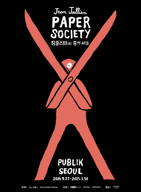 [아츠앤컬쳐] 세계적인 일러스트레이터 장 줄리앙(Jean Jullien)의 새로운 전시, <장 줄리앙의 종이세상(PAPER SOCIETY)>이 오는 9월 27일 서울 ‘퍼블릭가산 퍼블릭홀’에서 개최된다. 현대건설이 개발한 서울 최대 규모의 지식산업센터인 퍼블릭가산 내 퍼블릭홀은 300평 규모로, 다양한 전시, 강연, 이벤트를 유치할 수 있는 새로운 문화 트렌드의 복합문화공간이다.