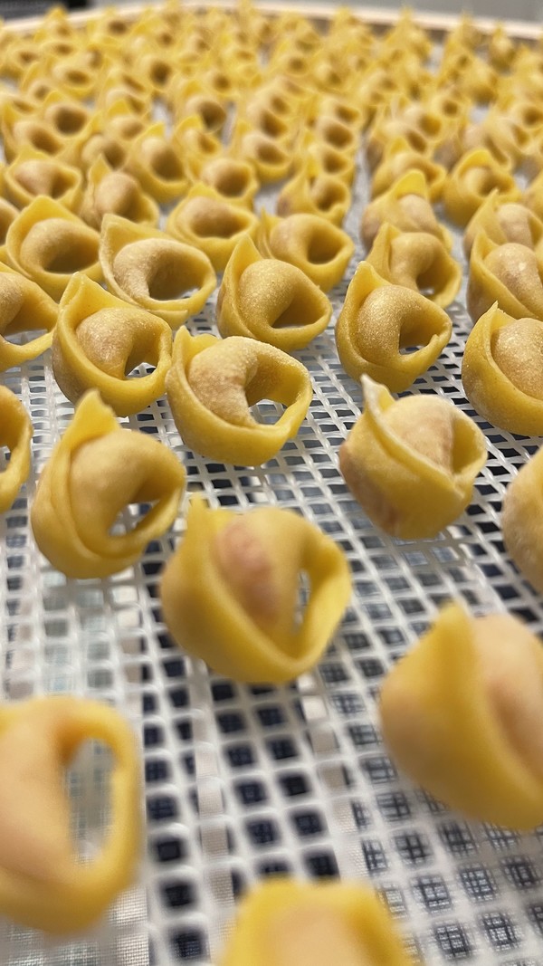 The most traditional way to enjoy Tortellini is in brodo (in broth). A clear, flavorful broth serves as a warm, comforting base, highlighting the taste of the pasta and filling. However, Tortellini is also often served with tomato-based sauces or butter with sage, each giving the dish a unique taste. Making Tortellini at home from scratch is a labour of love, an art form, and the result is well worth the effort—each delicate, flavour-packed with delicious taste. Fatto a mano (hand-made) produced Tortellini, requires rolling out fresh pasta dough, carefully cutting the pasta into square shapes (each around 3cm), placing a small amount of filling (about 1/4 teaspoon) in the centre of each square, folding it into a triangular shape, and finally curling it around a finger to achieve the classic “belly button” shape.