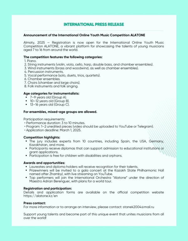 [아츠앤컬쳐] 알마티, 2025 - 전 세계 7~16세의 젊은 음악가들의 재능을 선보이는 활기찬 플랫폼 ALATONE 국제 온라인 청소년 음악 콩쿠르 공지