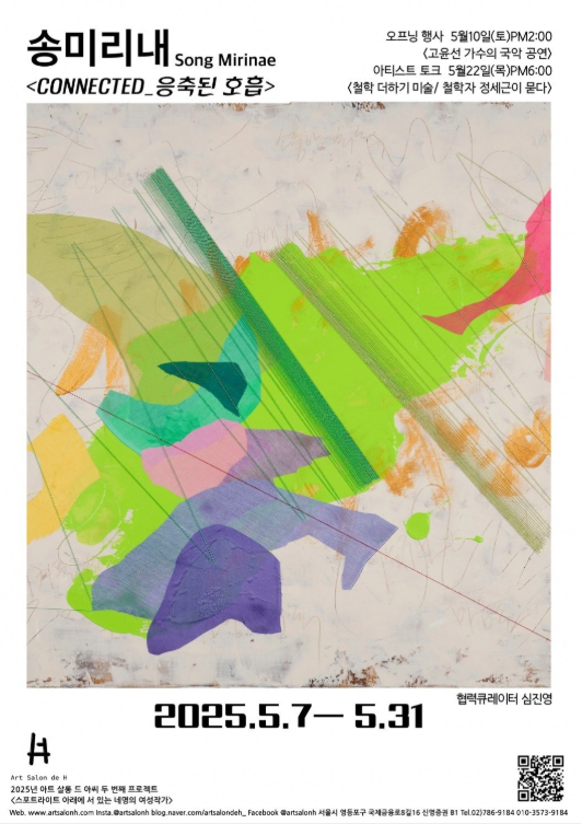 송미리내 작가의 전시 <CONNECTED_응축된 호흡>은 감정과 감각, 기억과 관계의 결이 켜켜이 쌓여 하나의 화면으로 응축된 섬세한 호흡의 기록이다. 그녀는 일상 속 스쳐 지나가는 미세한 감정의 떨림과 타인과 나눈 순간의 잔상을 예민하게 포착하고, 그것을 시간과 감정의 결로 직조해낸다. 작가는 언어로는 담기 어려운 교감의 순간들을 시각적 매체로 풀어내며, 관람자 각자의 감정과 기억을 섬세하게 환기시킨다.
