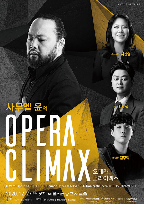 이번에는 ‘사무엘 윤의 오페라 클라이맥스’라는 타이틀로 유명 오페라 세 작품의 하이라이트를 준비한다. 사무엘 윤이 선택한 세 작품은 베르디 <아틸라>, 도니제티 <사랑의 묘약>, 구노 <파우스트>다. 이 작품을 함께하기 위해 최고의 오페라 가수들이 뭉쳤다.