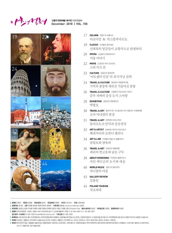 [아츠앤컬쳐] 관련기사 155호 표지 156호 목차 156호 표지 154호 표지 154호 목차 153호 표지 키워드 #아츠앤컬쳐 #artsnculture 아츠앤컬쳐 webmaster@artsnculture.com 다른기사 보기 저작권자 © Arts & Culture 무단전재 및 재배포 금지 당신만 안 본 뉴스 강재희 개인전 'Garden In Fall' 2025 예술가의집 & 꽃피는몸 프로젝트 공동기획 프로그램 2025 국립오페라단 정기공연 Ⅳ '트리스탄과 이졸데' ‘2026년 문예회관 특성화 지원 사업’ 확대 개편 예미 신간, '바다는 작은 물을 가리지 않는다' 강재희 개인전 'Garden In Fall' 댓글삭제 삭제한 댓글은 다시 복구할 수 없습니다. 그래도 삭제하시겠습니까? 비밀번호 닫기 기사 댓글 0 댓글 접기 로그인 후 이용 가능합니다. 댓글 내용입력 비회원 로그인 이름 비밀번호 댓글 내용입력 댓글쓰기 계정을 선택하시면 로그인·계정인증을 통해 댓글을 남기실 수 있습니다. 회원 로그인 비회원 글쓰기 이름 비밀번호 자동등록방지 로그인 옵션 창닫기 주요기사 예미 신간, '바다는 작은 물을 가리지 않는다' ‘2026년 문예회관 특성화 지원 사업’ 확대 개편 2025 국립오페라단 정기공연 Ⅳ '트리스탄과 이졸데' 강재희 개인전 'Garden In Fall' 2025 예술가의집 & 꽃피는몸 프로젝트 공동기획 프로그램 호두까기 인형: 해설이 있는 명품 발레